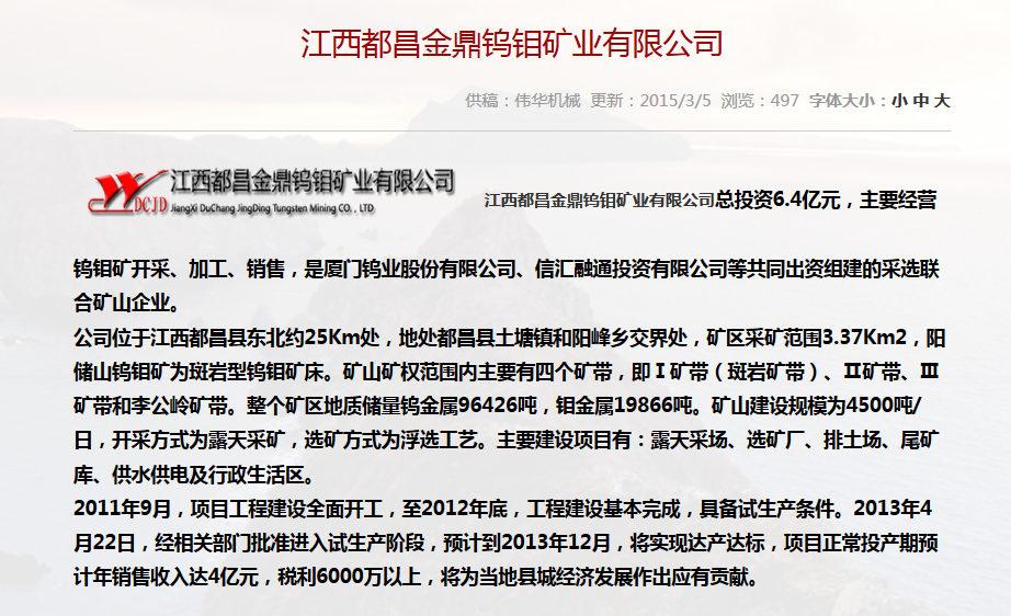 • 合作單位:江西都昌金鼎鎢鉬礦業有限公司